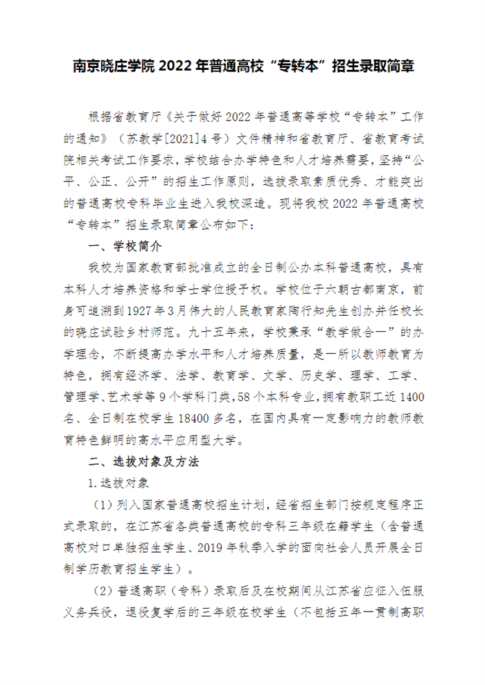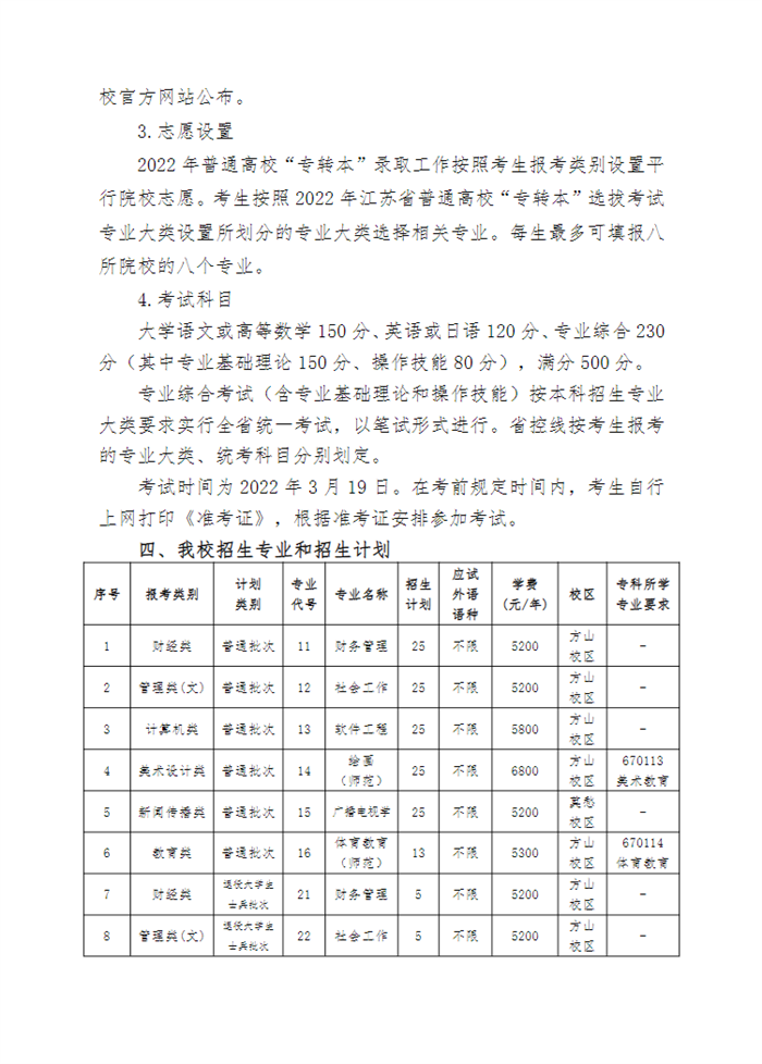 南京晓庄学院2022年普通高校“专转本”招生录取简章